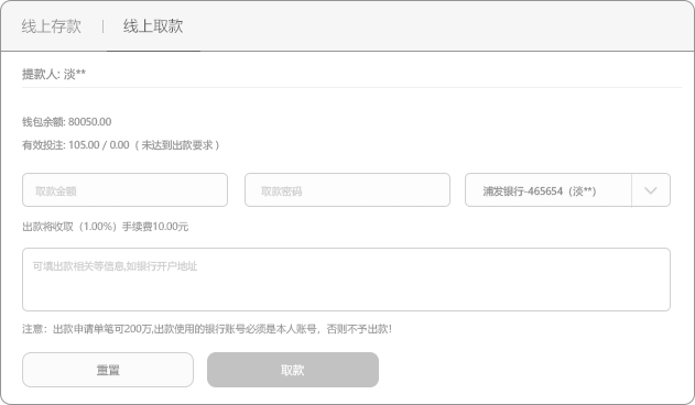 02填写取款金额、填写取款密码、选择转入的银行账号、填写备注、点击"取款";